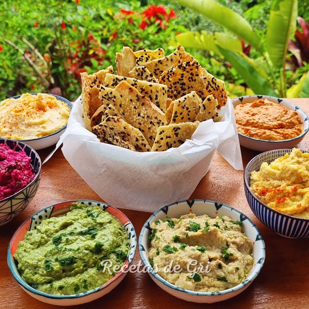 Una entrada colorida y especial: untables vegetales caseros y crackers crujientes, ideales para compartir.